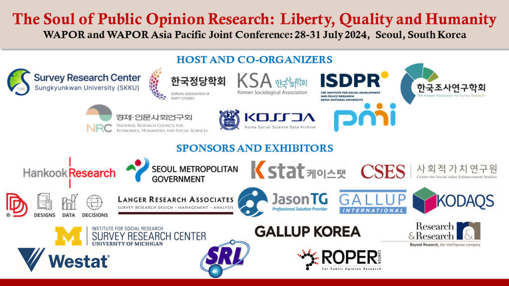 Among our sponsors and exhibitors this year are: Seoul Metropolitan Government; Ministry of Unification; Center for Social Value Enhancement Studies; D3 Design Data Decisions; Gallup Korea; Hankook Research; K-stat; Jason TG; Langer Research Associates; Survey Research Center at the University of Michigan; Gallup International; Research& Research; Survey Research Lanka; Westat; KODAQS; Roper Center.