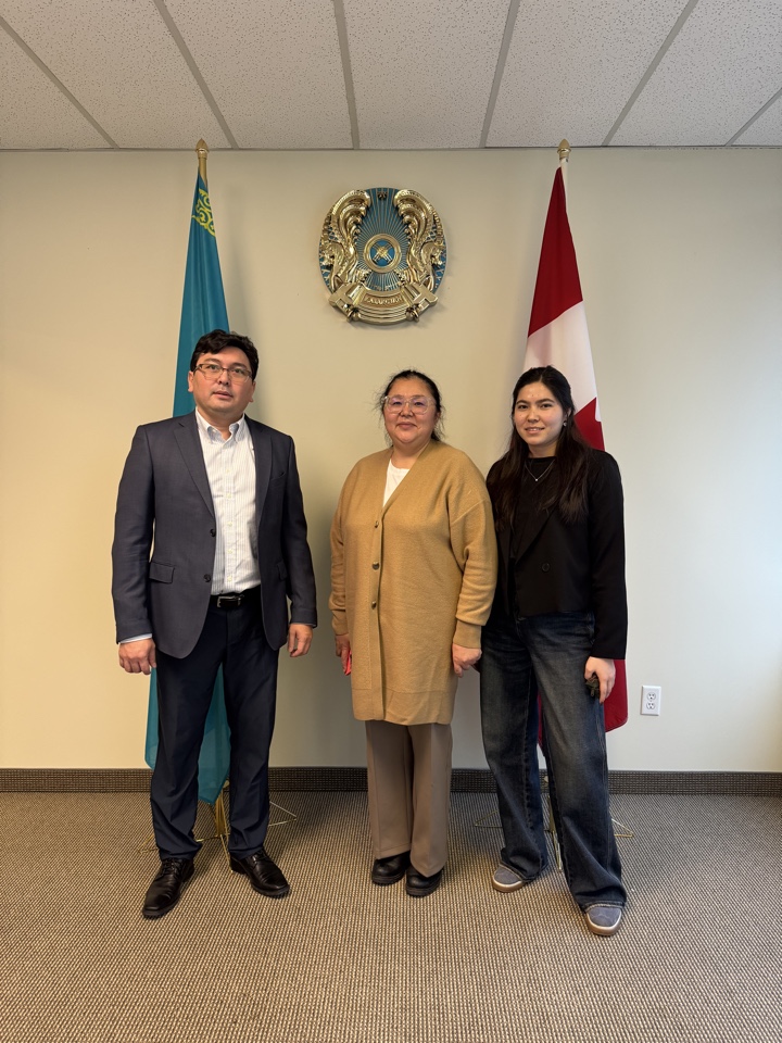 24 ноября 2025 года в рамках проекта НАО «Фонд Отандастар» директор Исследовательского института «Общественное мнение» Ботагоз Ракишева и младший научный сотрудник Аружан Көміртай, магистрант кафедры социологии ЕНУ им. Л. Н. Гумилёва встретились с Консулом, руководителем Консульства Республики Казахстан в г. Торонто Алмазом Садыровым в здании Консульства Казахстана в Торонто.